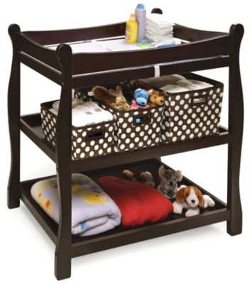 Badger Basket sleigh-style changing table has traditional, enduring style Baby furniture features two nicely-sized shelves and ample room on top for changing diapers or dressing your baby Changing table is made of quality hardwood with a non-toxic espresso finish Can be used with children weighing up to 30 pounds (13.6 kilograms) When baby outgrows this table, it can be used as a useful and attractive piece of furniture for holding clothes or toys Also includes changing pad and safety strap Safety rails enclose all four sides around top of table Metal support bar beneath changing surface provides additional stability With the addition of two or four of our handy baskets (sold separately) you can easily store and organize your changing supplies Wipe clean with mild soap and a damp cloth when needed Overall size measures 37.5 inches long x 19 inches wide x 37.5 inches high Shelves measure 32 inches long x 17.5 inches deep with a 1.375-inch lip around all four edges to keep items from falling off Illustrated assembly instructions included Due to differences in computer display technology, actual color/finish may vary slightly from screen display Toys, baskets and accessories shown with table are for illustration purposes only and are not included Item ships in its original carton, which may include a photo of the product