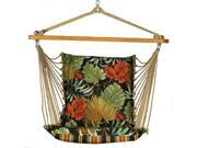 Enjoy all that summer has to offer from this comfortable cushioned hanging chair. Made with two different patterns of weather resistant fabric, it features foam-filled fabric on the chair and mildew-resistant polyester rope cord. Macrame clewed ends Outdoor plated steel rings 100% Poly rope cord 40"W hardwood spreader bar Foam filled cushion both seat and back Hangs from trees, porches, patios or fits Stand not included Made in the USACountry of Origin: USA Cubic Feet: 2.62 Fabric color: Tropique Raven Lyndhurst Raven Height: 28 Length: 26 Longest Length: 41 Shortest Length: 10-1 2 Weight: 275 lbs Width: 22