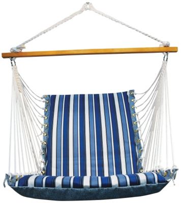 Find hammocks and swings at Target.com! Create the ultimate summer hangout with this soft comfort patio hanging chair from algoma. Made from durable, weather-resistant polyester, this tropical-patterned chair has a wide seat and padded, polyester-fiberfill cushions. Featuring macram clew ends, plated-steel rings and a wooden spreader bar, it hangs on mildew-resistant polyester rope cord. The hanging chair stand is sold separately.