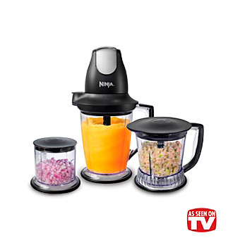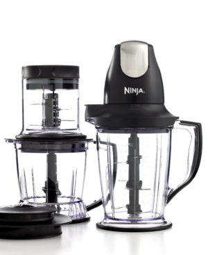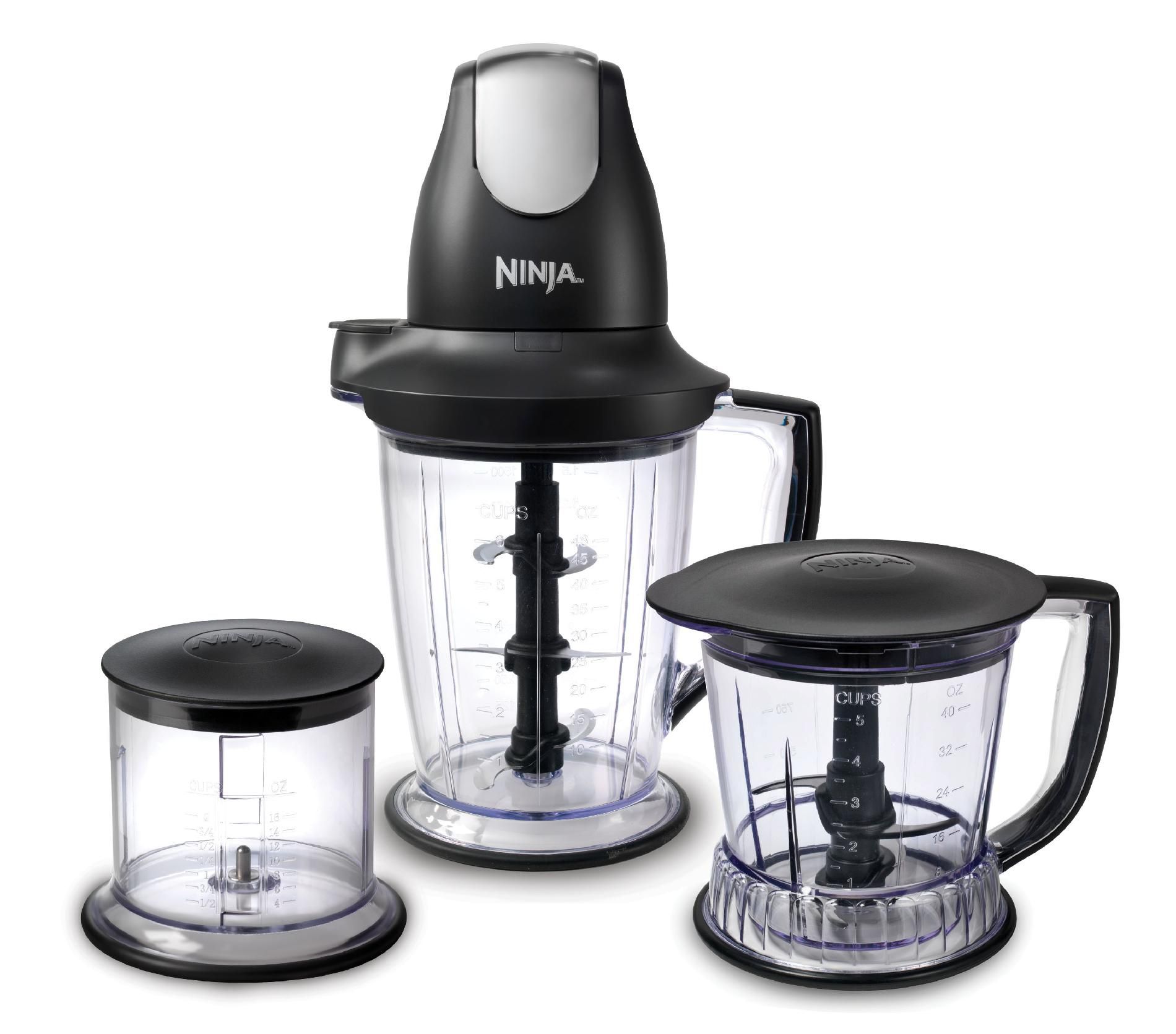 Food Processors and Choppers. Blend, chop and process foods with this Ninja New Master Prep Professional food processor. Tackle any blending or food processing task like a Ninja with this new and improved food processor. The tall 48-oz. pitcher features uniquely stacked, precision Ninja blades that not only cut through whatever type of food you put in the jar, but processes it two times faster than the original Ninja. The Ninja's pulse function will allow you to mince, dice, chop and blend without soggy results. You will even be able to crush solid ice cubes into fluffy snow. Includes 3 containers: one 48-oz. pitcher, one 40-oz. pitcher and one 16-oz. bowl All containers come with custom storage lids and blades Convenient storage lids allow you to create, store, microwave and serve 450 watts of power Parts are dishwasher and microwave safe Includes recipe booklet with over 25 recipes Model number: QB1004 Imported